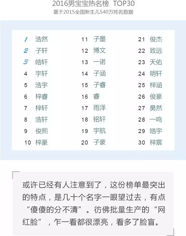 日前,中國首份姓名大數(shù)據(jù)報(bào)告《2016大數(shù)據(jù)“看”中國父母最愛給寶寶起什么名》新鮮出爐,2016年女寶熱名前三為梓萱、梓涵、詩涵,男寶熱名前三為浩然、子軒、皓軒。中國前100個(gè)重名率最高的名字,在全國覆蓋的人口超過10%。影視劇和綜藝節(jié)目對(duì)新生兒起名有影響。
